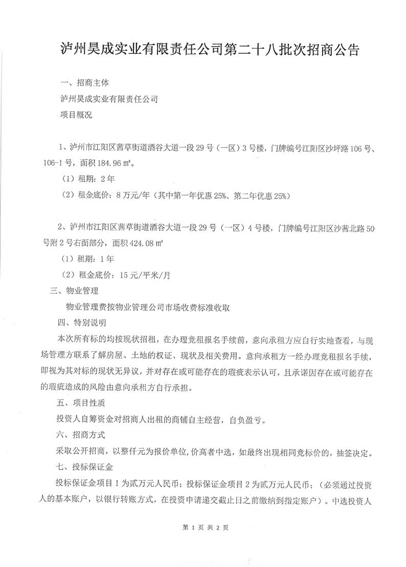 瀘州昊成實業(yè)有限責(zé)任公司第二十八批次招商公告